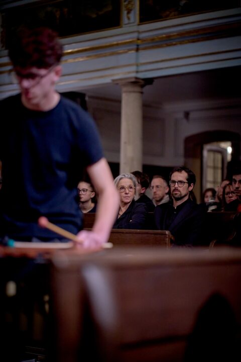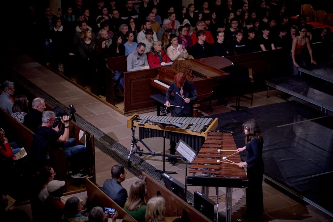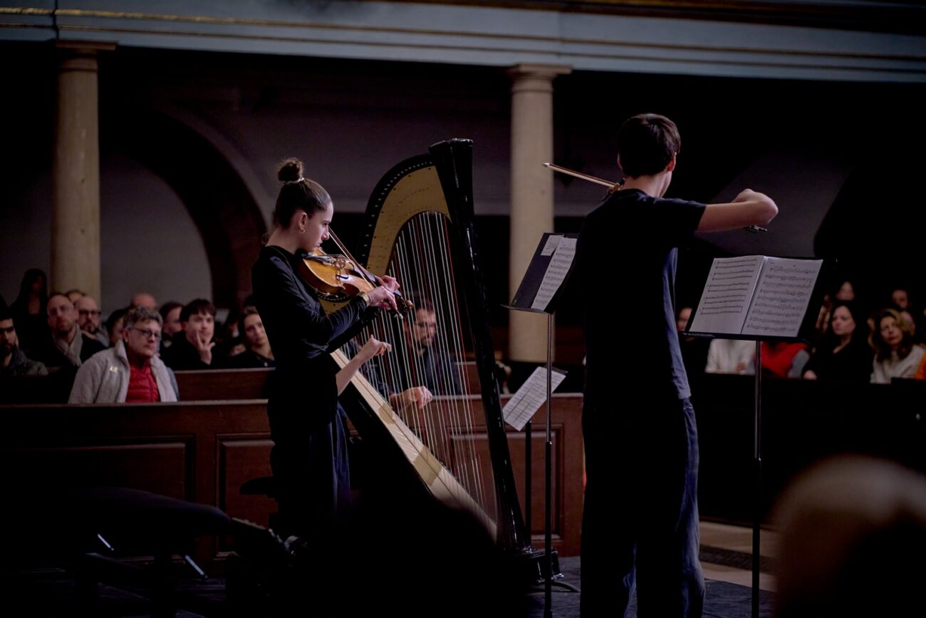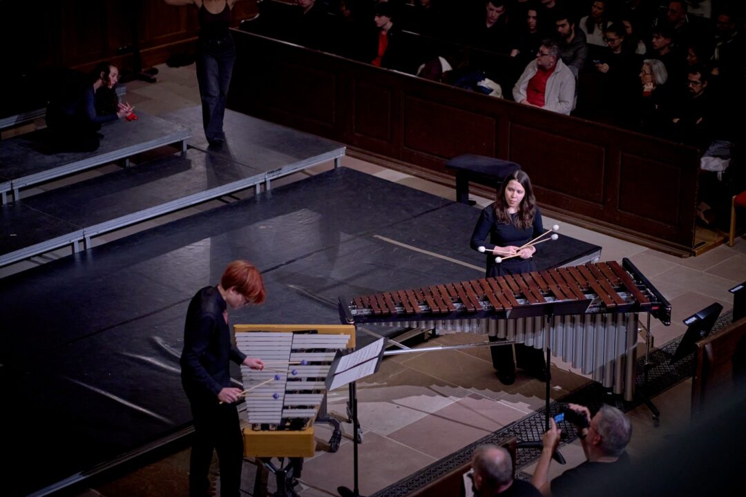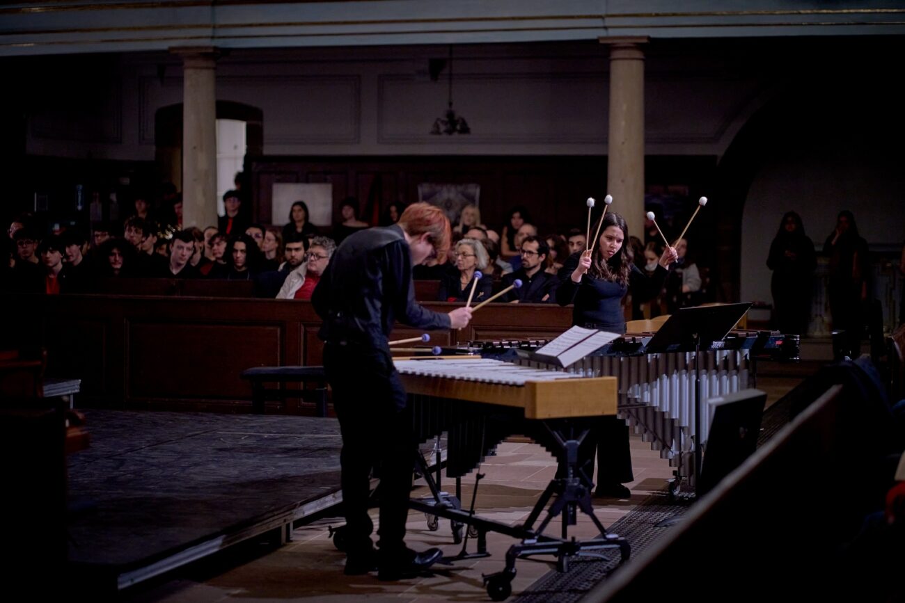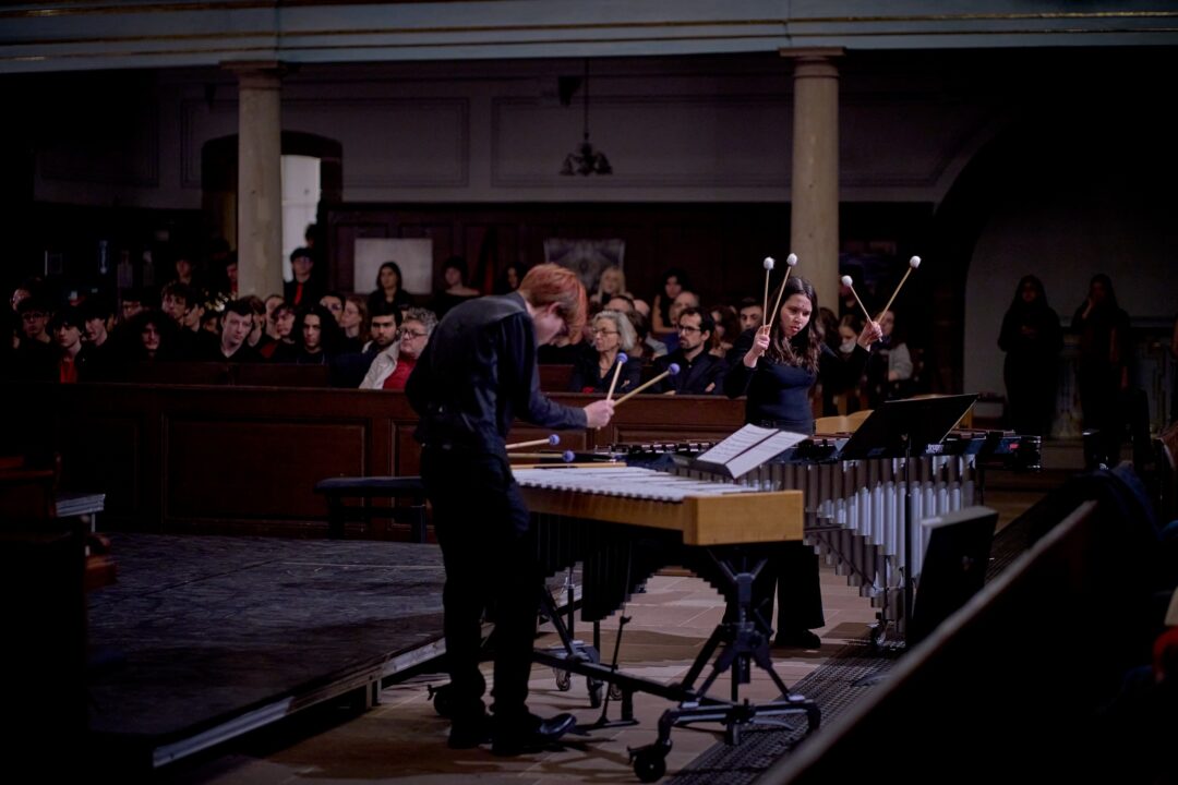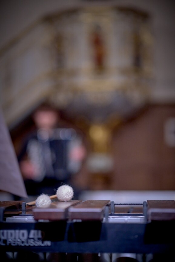 La configuration de l’église Sainte Aurélie permettait de belles possibilités de spatialisation, des occasions de jouer avec l’acoustique, que n’ont pas manqué d’exploiter les deux enseignants, Marie-Annick Guillemin et François Lecourt, pour surprendre les spectateurs.
